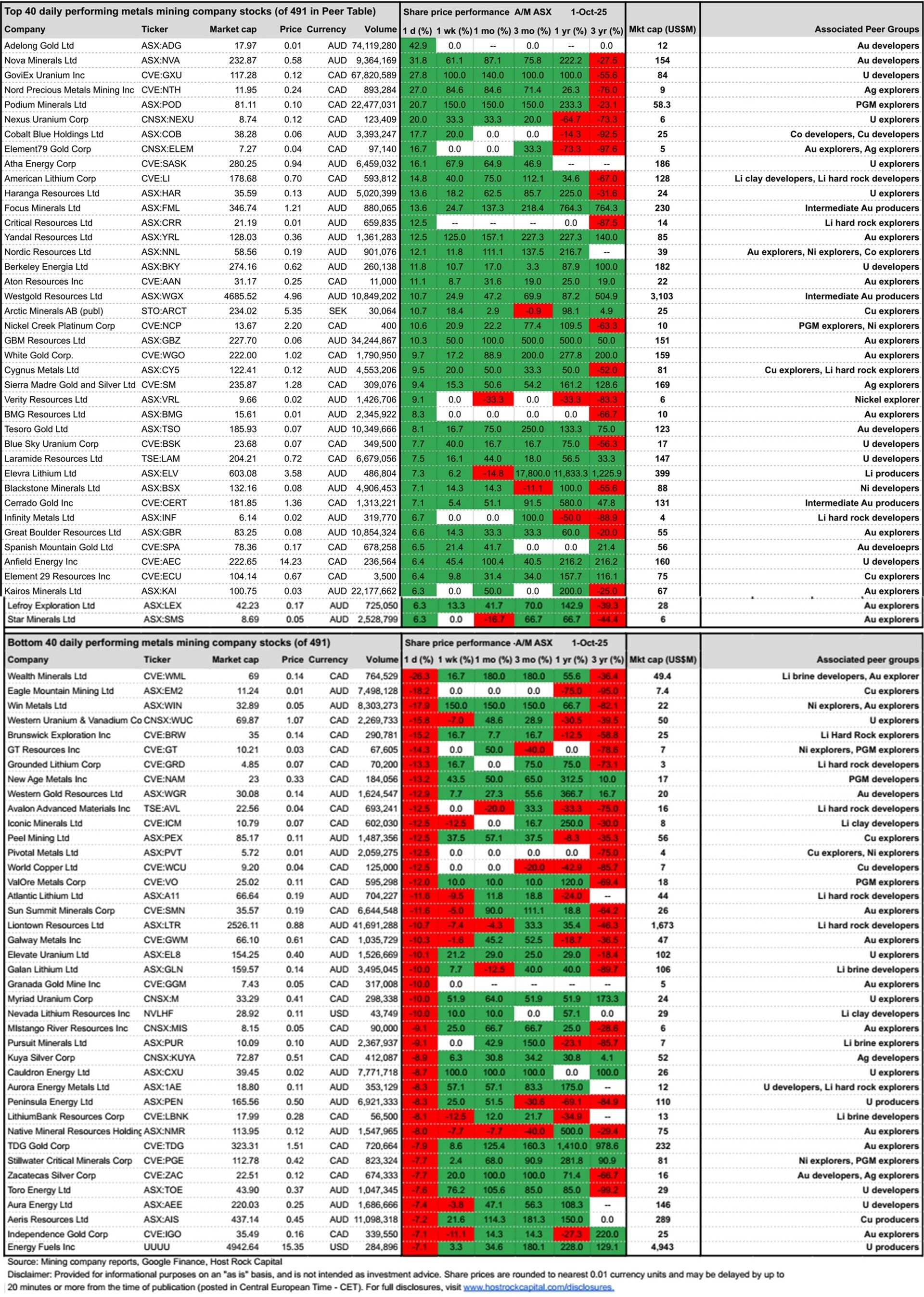 Top and bottom 40 daily performing mining company stocks (out of 491 in our Peer Table) through ASX trading (including yesterday’s TSX/NYSE movements) include: