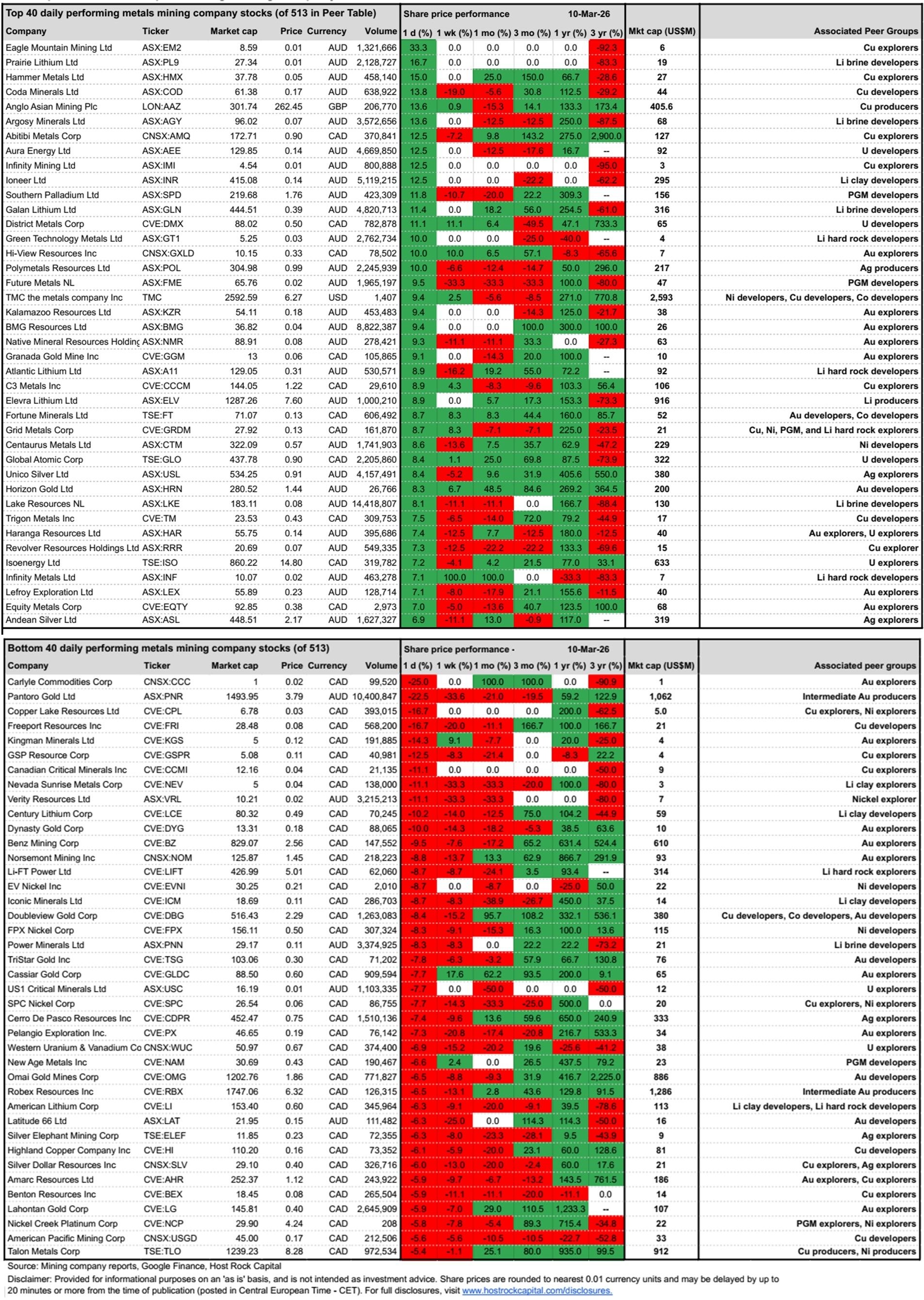 Top and bottom 40 daily performing metals mining company stocks (out of 512 in our Peer Table) through ASX trading (including yesterday’s TSX/NY movements):