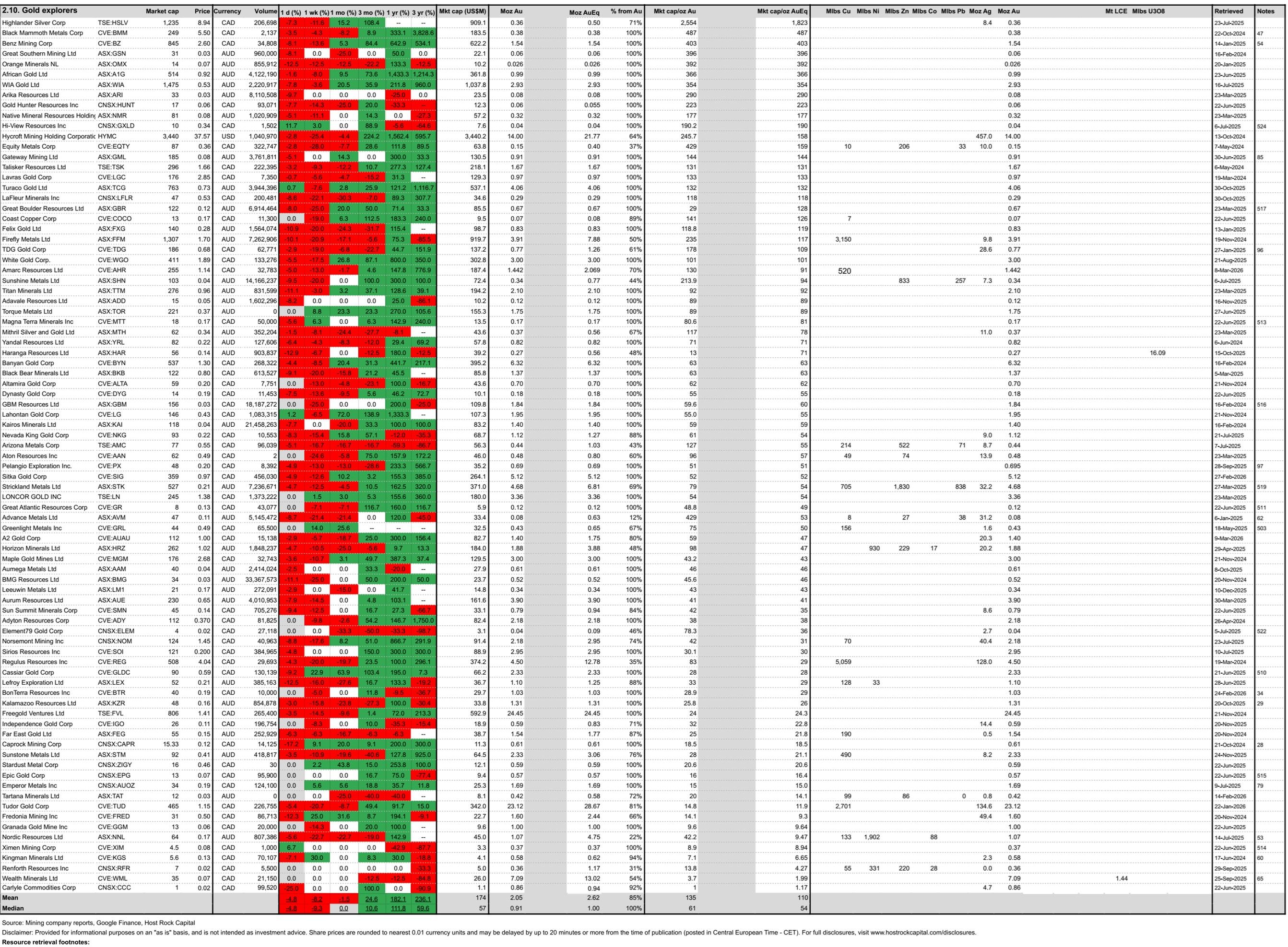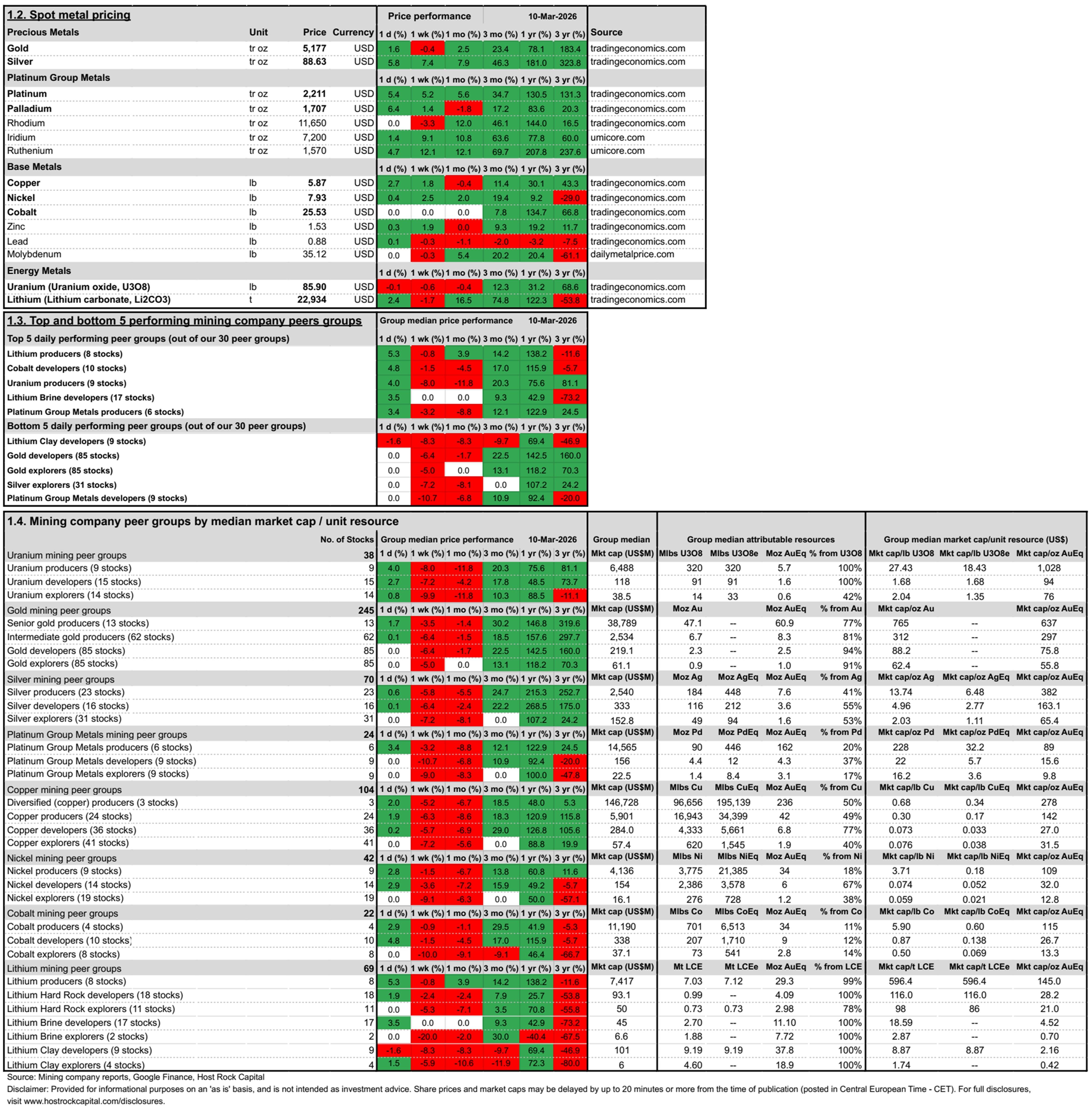Today’s metal price movements (over past ~24hrs) and mining company peer group movements through ASX trading (including yesterday’s TSX/NY movements):