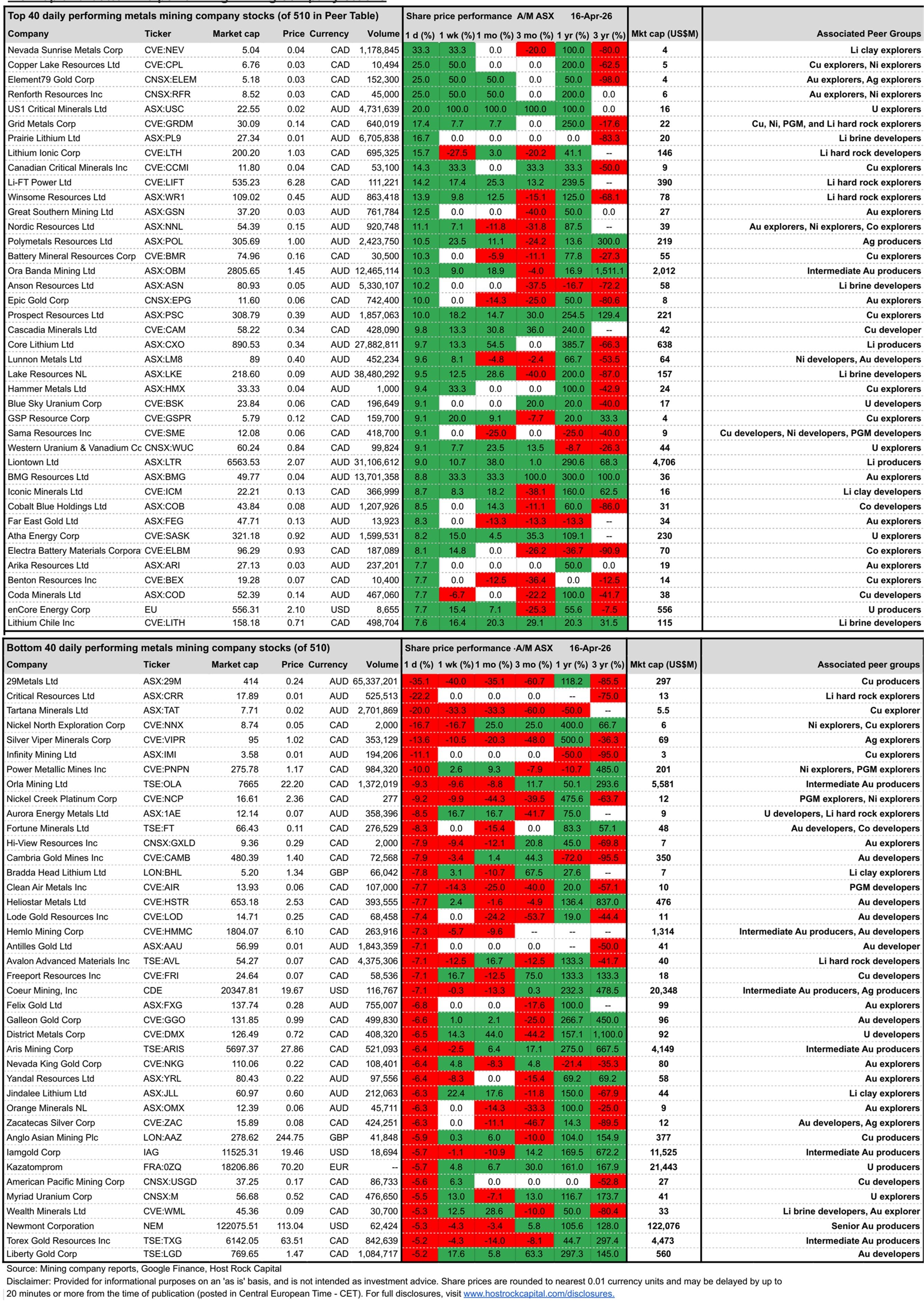 Top and bottom 40 daily performing metals mining company stocks (out of 511 in our Peer Table) through ASX trading (including yesterday’s TSX/NY movements):