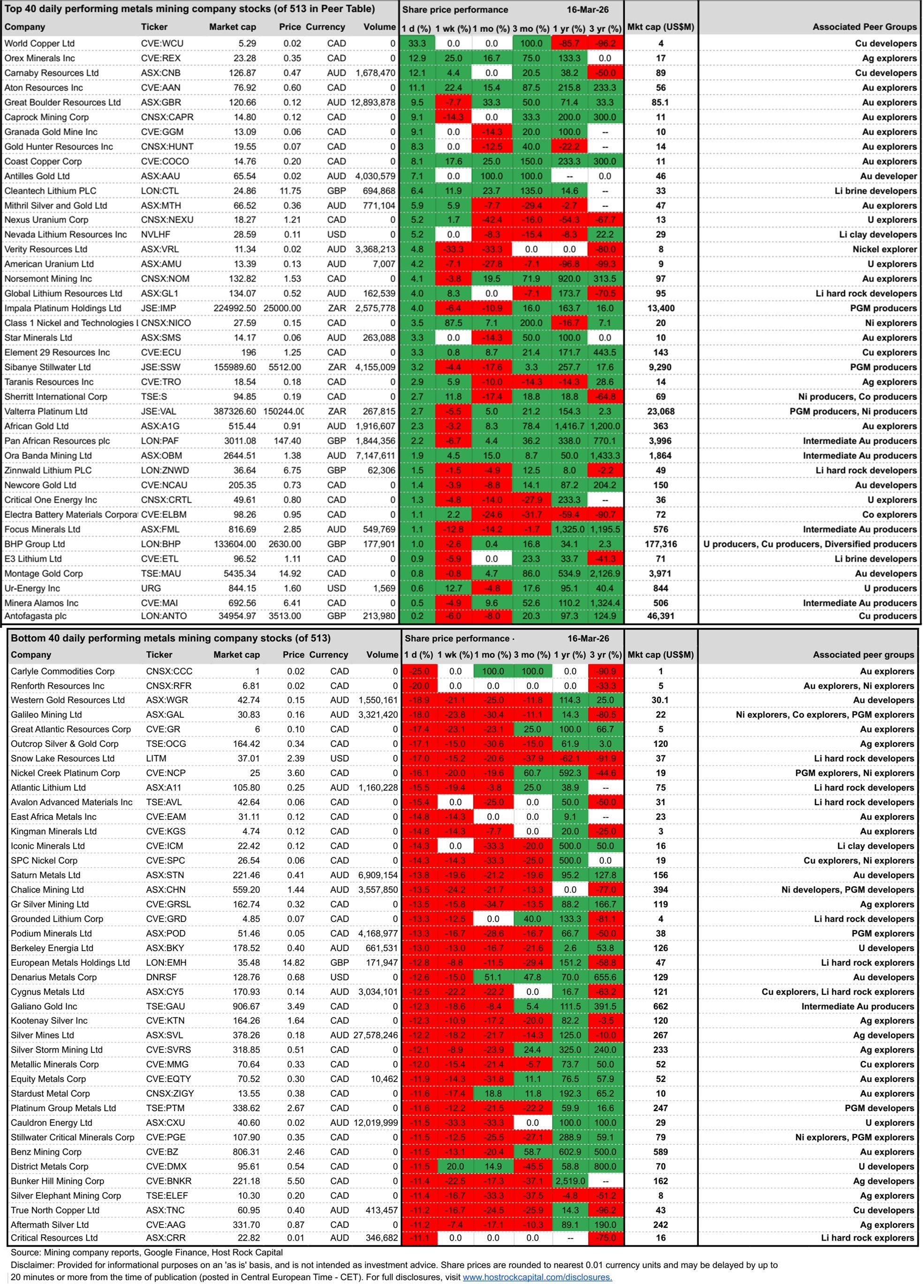 Top and bottom 40 daily performing metals mining company stocks (out of 513 in our Peer Table) through ASX trading (including Friday’s TSX/NY movements):