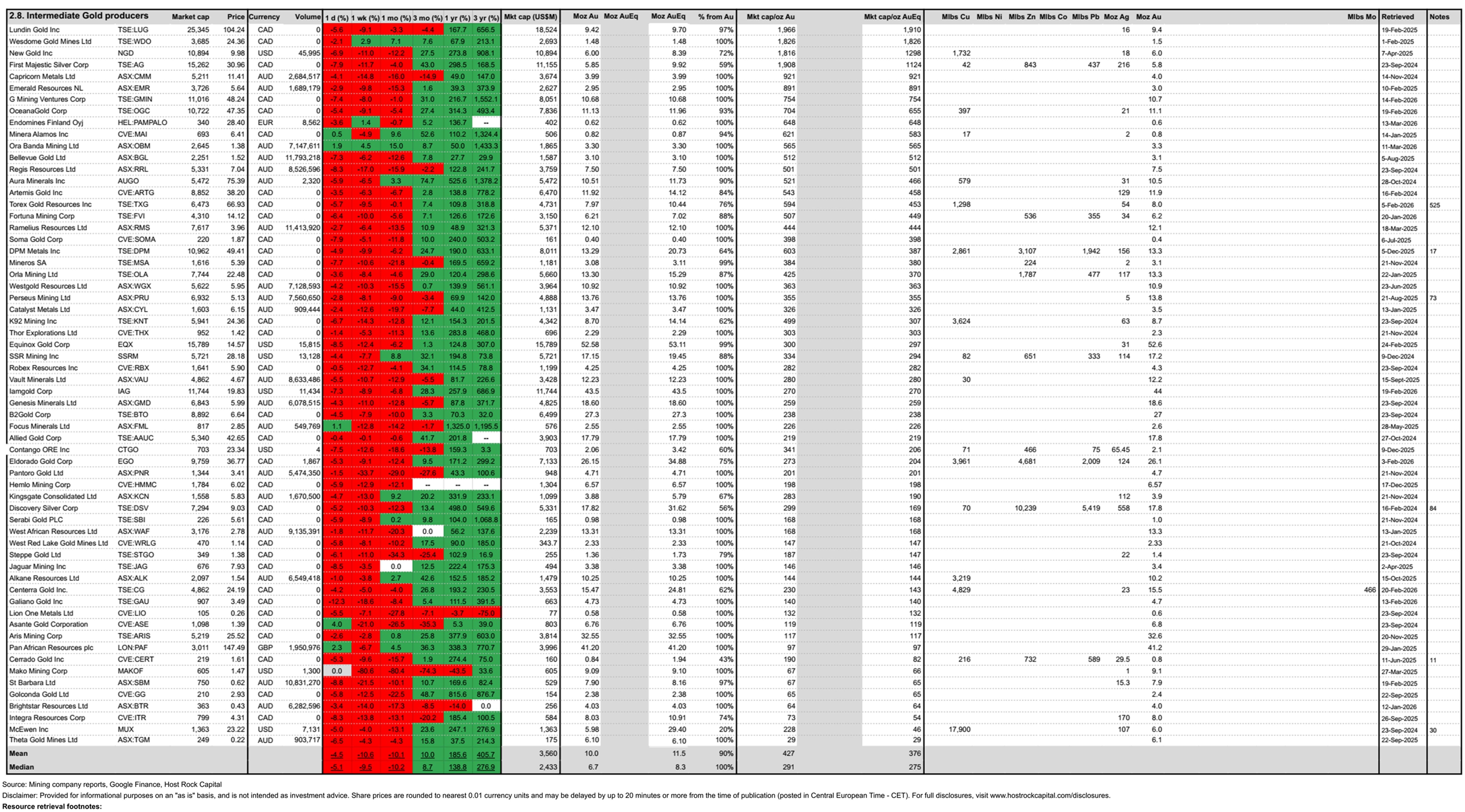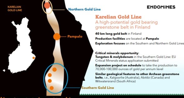 Intermediate gold producer Endomines (HEL:PAMPALO) announced Friday (13 Mar) updated estimates of reserves and resources that grew its overall Karelian Gold Line gold resources by +26% to 0.62Moz Au @ 1.85g/t Au within 11.66Mt, and grew reserve tonnage by +9.5% to 0.64Mt @ 2.29 g/t Au for 47.5koz (vs. ENDO’s 2025 production of 14.3 koz Au that was short of guidance of 16-22 koz). Endomines has come a long way in accumulating reserves and resources at its Pampalo mine and Karelian Gold Line trend since restarting its centrally located 0.45 mtpa Pampalo mill in December 2021 and (re)listing in Helsinki in Dec 2022 – and has not only replenished its production, but has also grown a multi-year runway of reserves as well as grown Karelian Gold Line resources close to management’s initially envisioned 1Moz target (that had appeared ambitious years ago) – helped by drilling success and a major new discovery (also announced last week on 10 Mar) of the Kartitsa (starter) deposit that accounts for 124koz of the company’s (620koz) resources. And the company is now targeting gold resources of 1.5-2Moz by 2030, with an aim to expand its mine and mill to allow for a multi-fold increase in gold production (targeting 70-100 koz per annum by 2030), according to company reports. Endomines stock gained +1% last week (ending 14 Mar intraday) on the back of this news (substantially outperforming our 62-company intermediate gold producer median weekly drop of -10%) to €28.30/sh (14 Mar intraday), market cap €341m, and market cap/oz resource US$649/oz – a premium to group median US$275/oz AuEq, with the premium appearing attributable to Endomine’s decent 2025 cash flow from operations of €13.1m at starter production rate, relative to still relatively small/starter resources of ~0.6Moz (and due to 2030 targeted multi-fold increases to these figures).