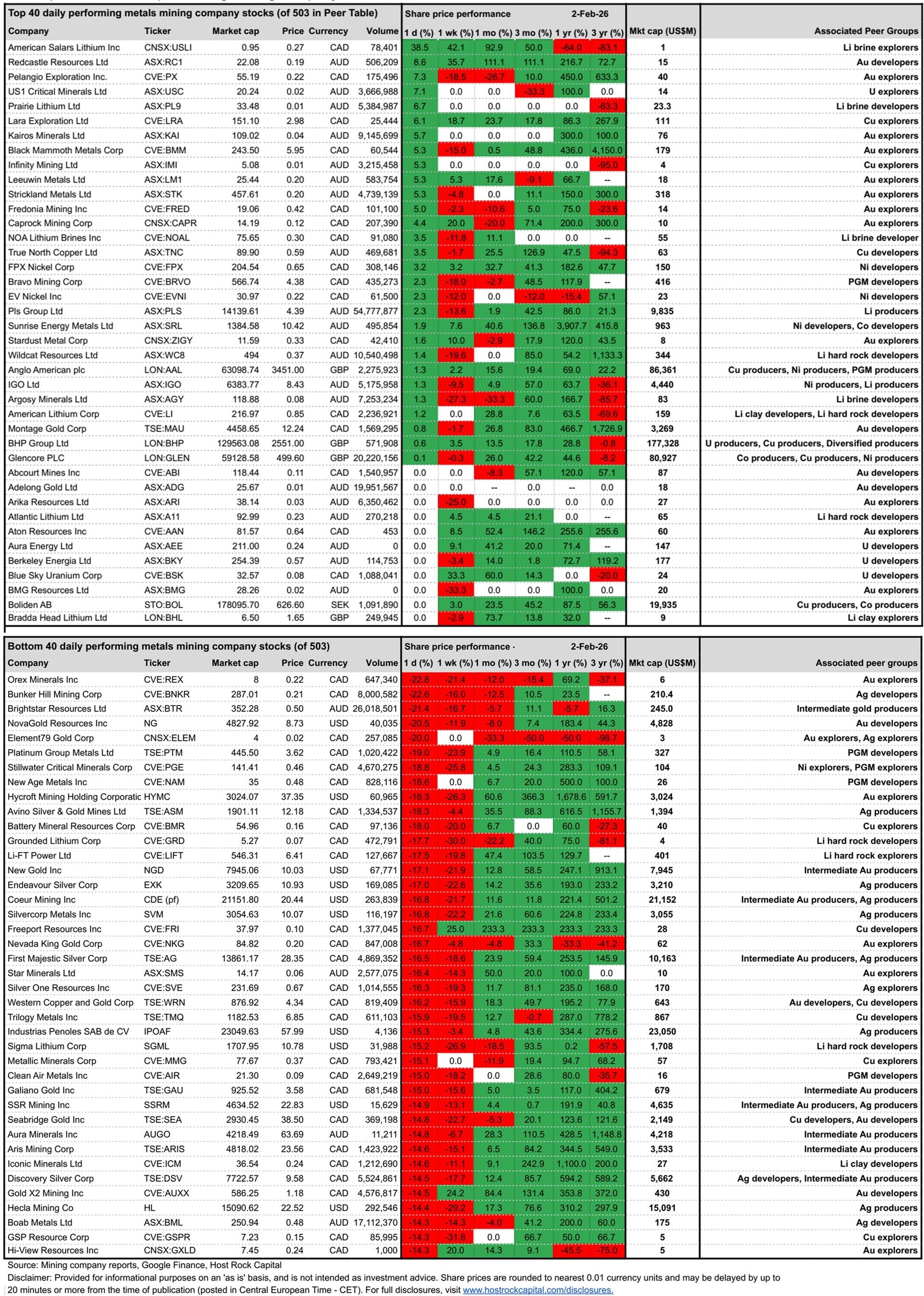 Top and bottom 40 daily performing metals mining company stocks (out of 503 in our Peer Table) through ASX trading (including Friday’s TSX/NY movements):