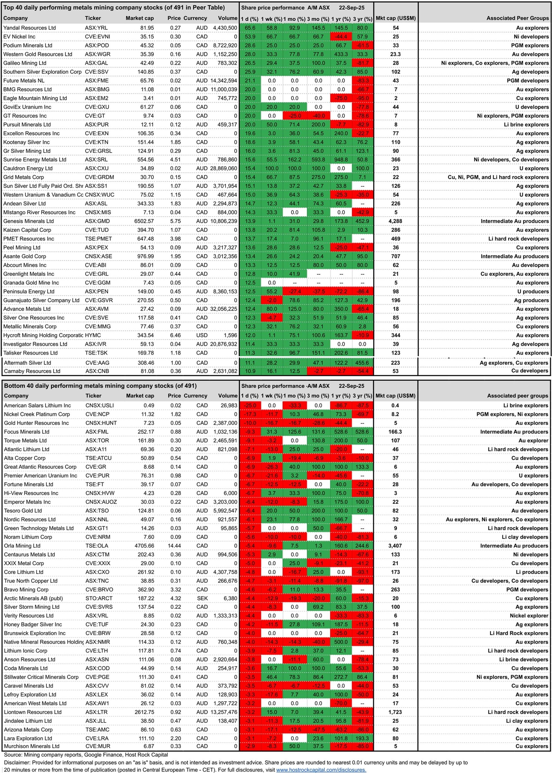 Top and bottom 40 daily performing mining company stocks (out of 491 in our Peer Table) through ASX trading (including Friday’s TSX/NYSE movements) include: