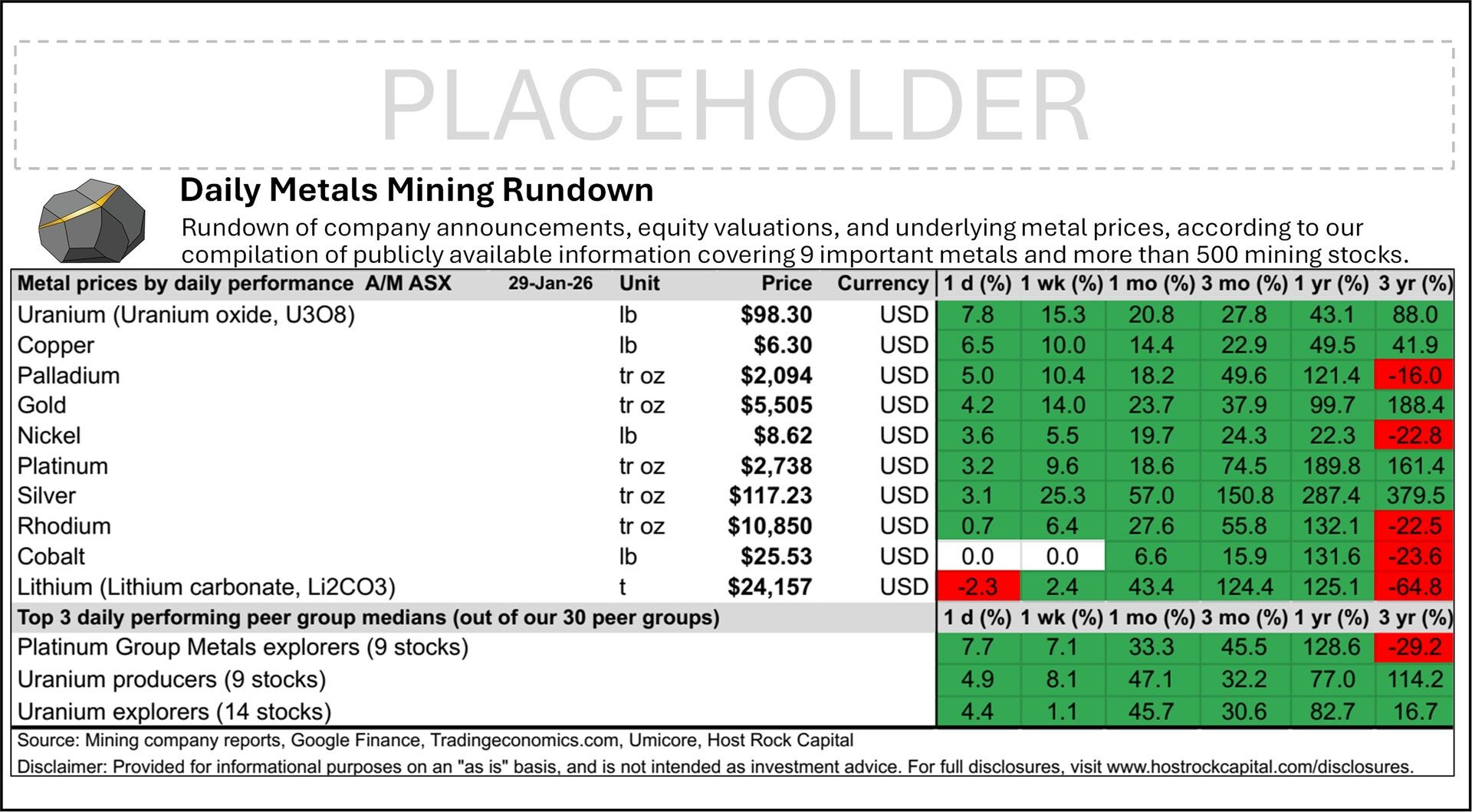Metal prices surged again over past ~22hrs, with the gold price breaching the $5,500/oz level after rising +4% to $5,505/oz, outperformed by uranium, copper, and palladium rising +8%, +6.5%, and +5% to $98.30/lb U3O8, $6.30/lb Cu, and $2,094/oz Pd, with nickel platinum, silver, and rhodium also rising +3-4%; Uranium stocks outperformed among metals miners over the trading session, while gold and copper miners also mostly inched higher and lithium stocks mostly fell sharply by multiple percent.